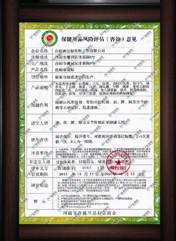 祛痛保健貼風(fēng)險評估證明